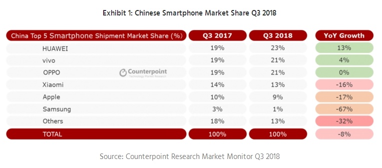 oint数据显示Counterp,年第三季度并没有展示苏醒迹象中国智妙手机销量正在2018,比旧年降落8%截至本季度末同,伸长2%但同比。