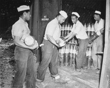 入伍职员……将 6 英寸炮弹放入水师弹药库“正在新赫布里底群岛的埃斯皮里图桑托号服役的。家档案馆供给”/ 美国国,共享资维基源