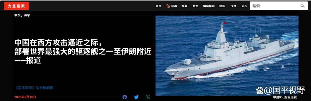 10日2月,志网站报道军事寓目杂,音信称据多方,伊朗)挨近之际正在西方攻击(,万吨大驱为重心的特遣舰队中国役使了以1艘055型,1艘“眺望一号”海上归纳戒备舰成员另有1艘052D型摈弃舰和,和印度洋北部周边海域现已计划到了阿曼湾。