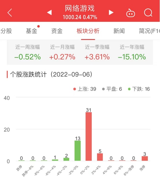 9月6日讯 今日中国经济网北京,体涨幅0.47%收集游戏板块整,只股票上涨此中39,票平盘6只股,股票下跌16只。